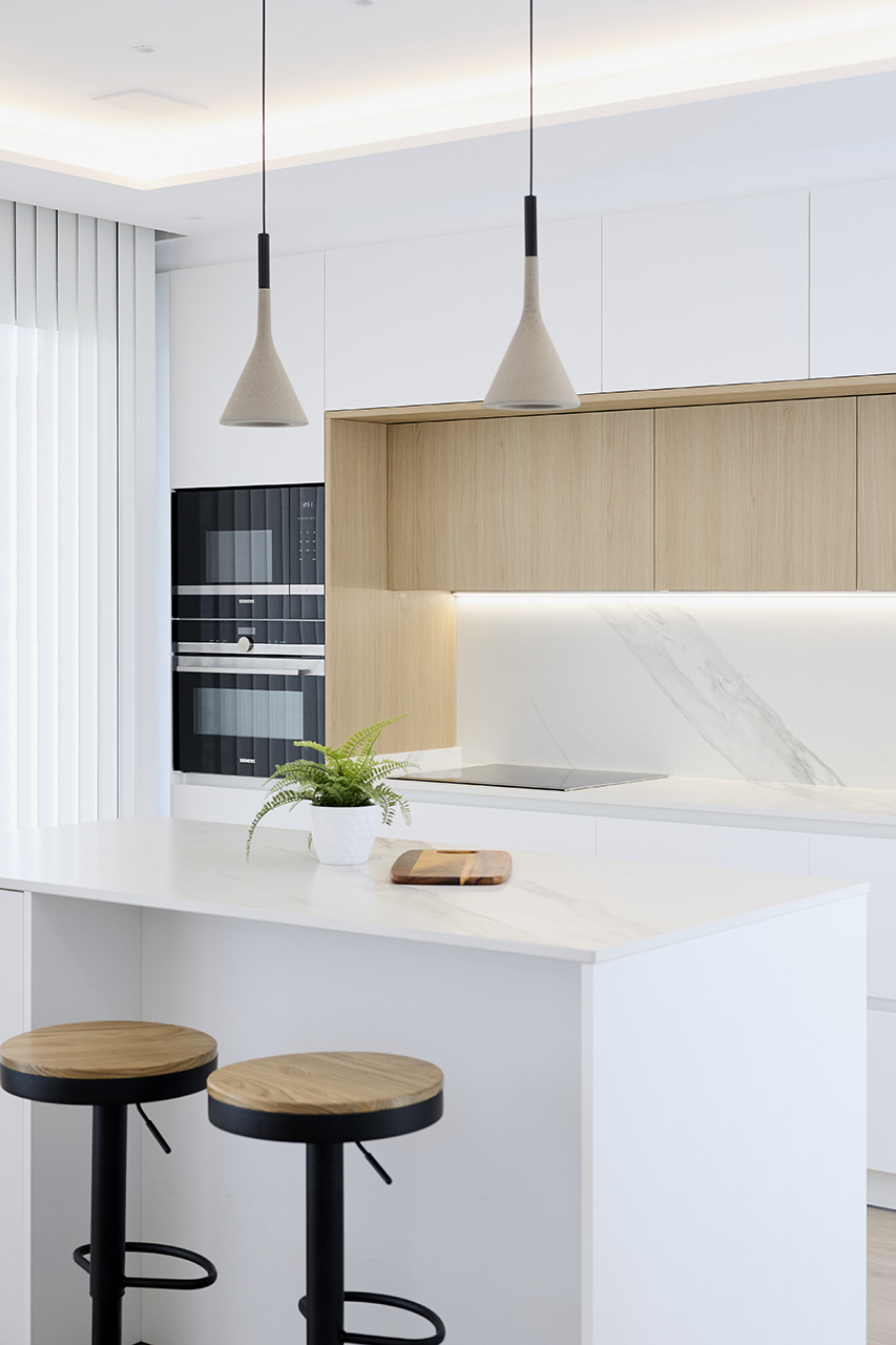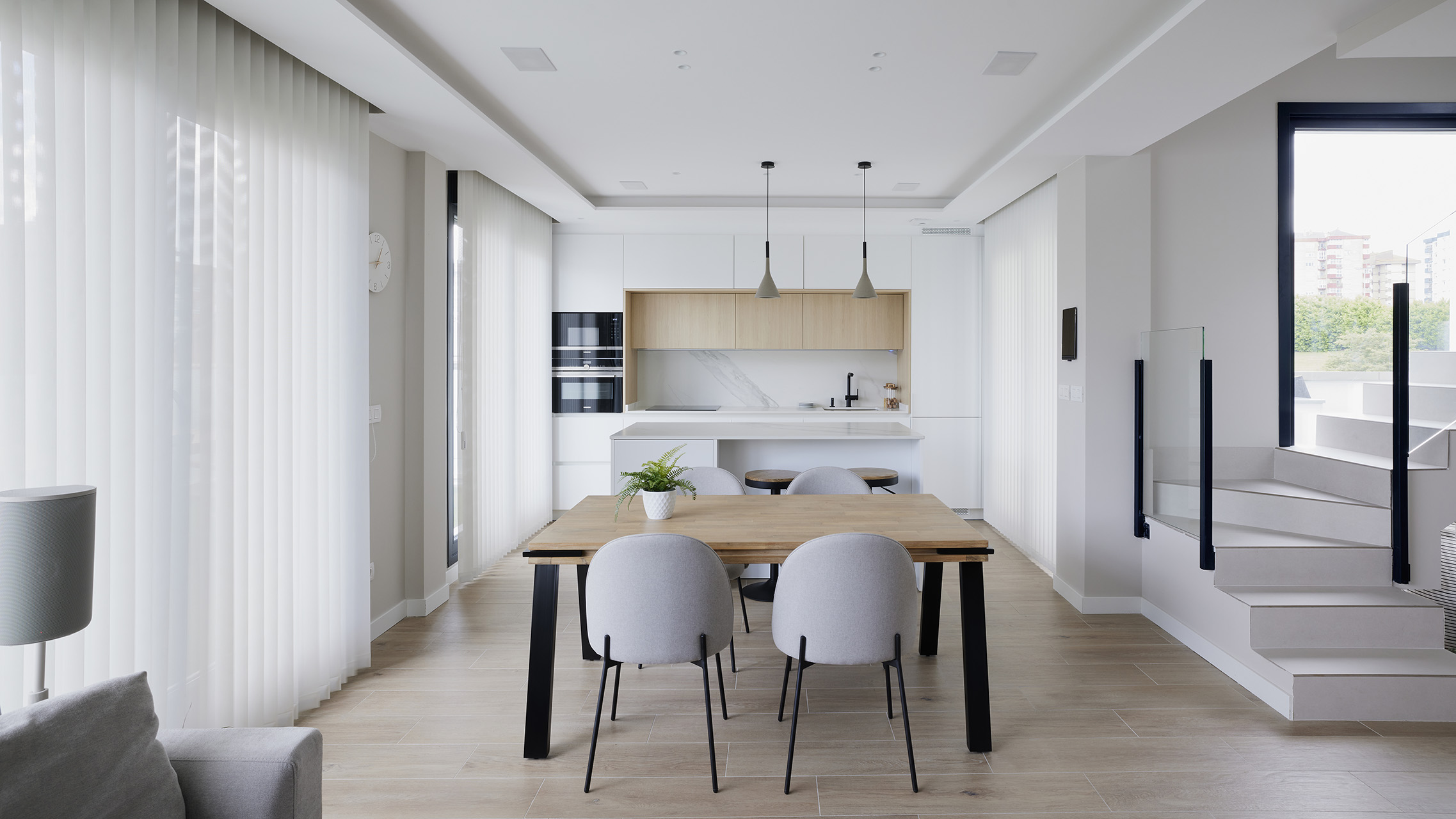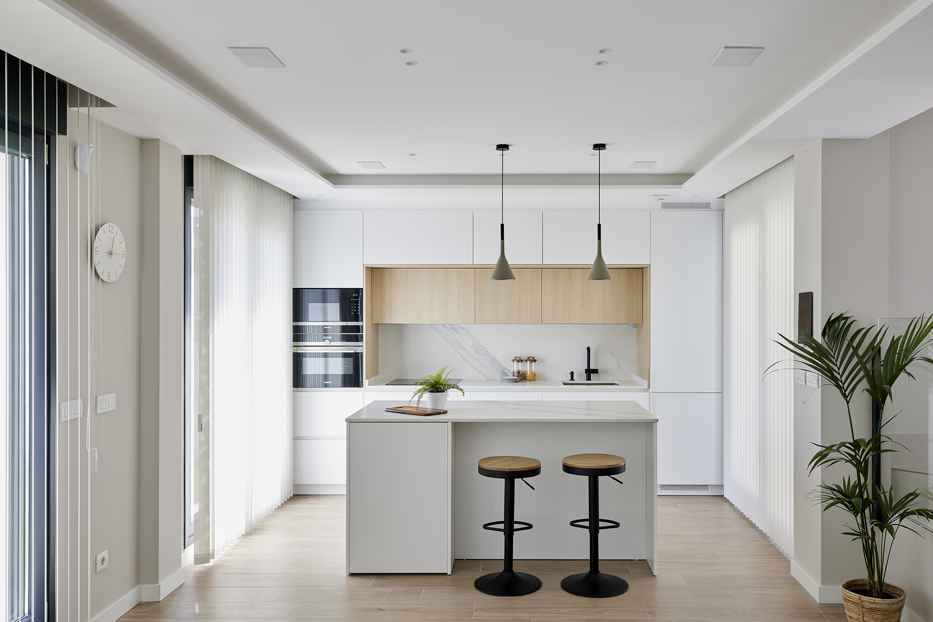 La paleta de colores en blancos y maderas claras aporta frescura y calidez, mientras que los detalles en negro proporcionan un toque moderno. Además de ser visualmente atractiva, la cocina es muy funcional, con amplias superficies de trabajo y un gran almacenamiento. La isla también incluye una zona de taburetes, convirtiéndose en un espacio social ideal.