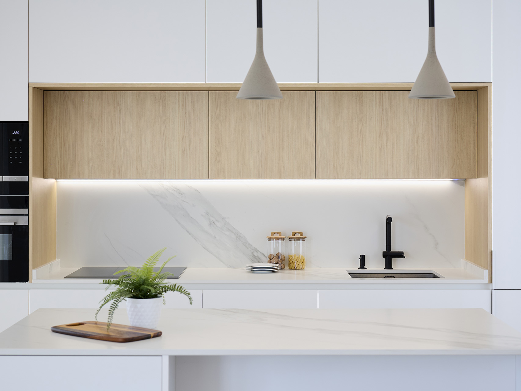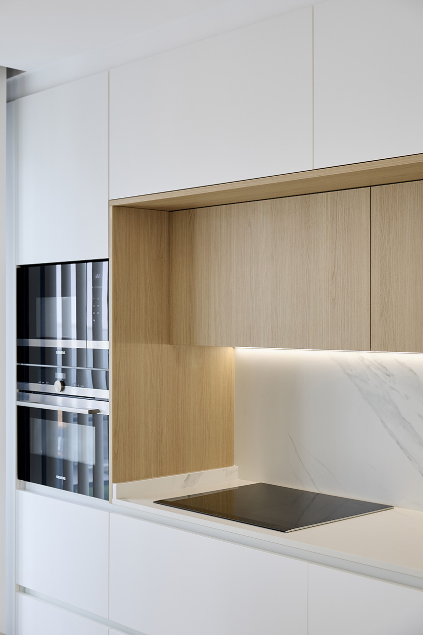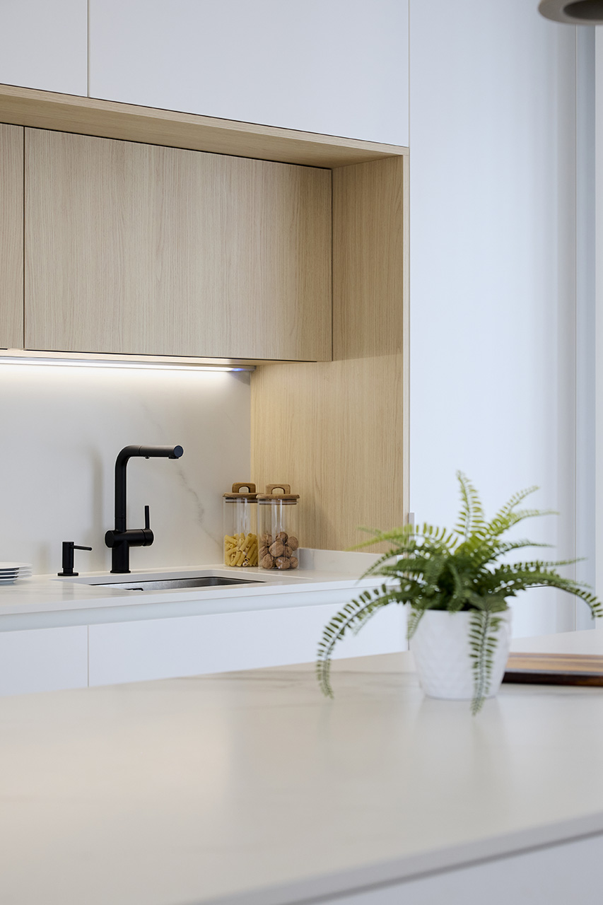 La paleta de colores en blancos y maderas claras aporta frescura y calidez, mientras que los detalles en negro proporcionan un toque moderno. Además de ser visualmente atractiva, la cocina es muy funcional, con amplias superficies de trabajo y un gran almacenamiento. La isla también incluye una zona de taburetes, convirtiéndose en un espacio social ideal.