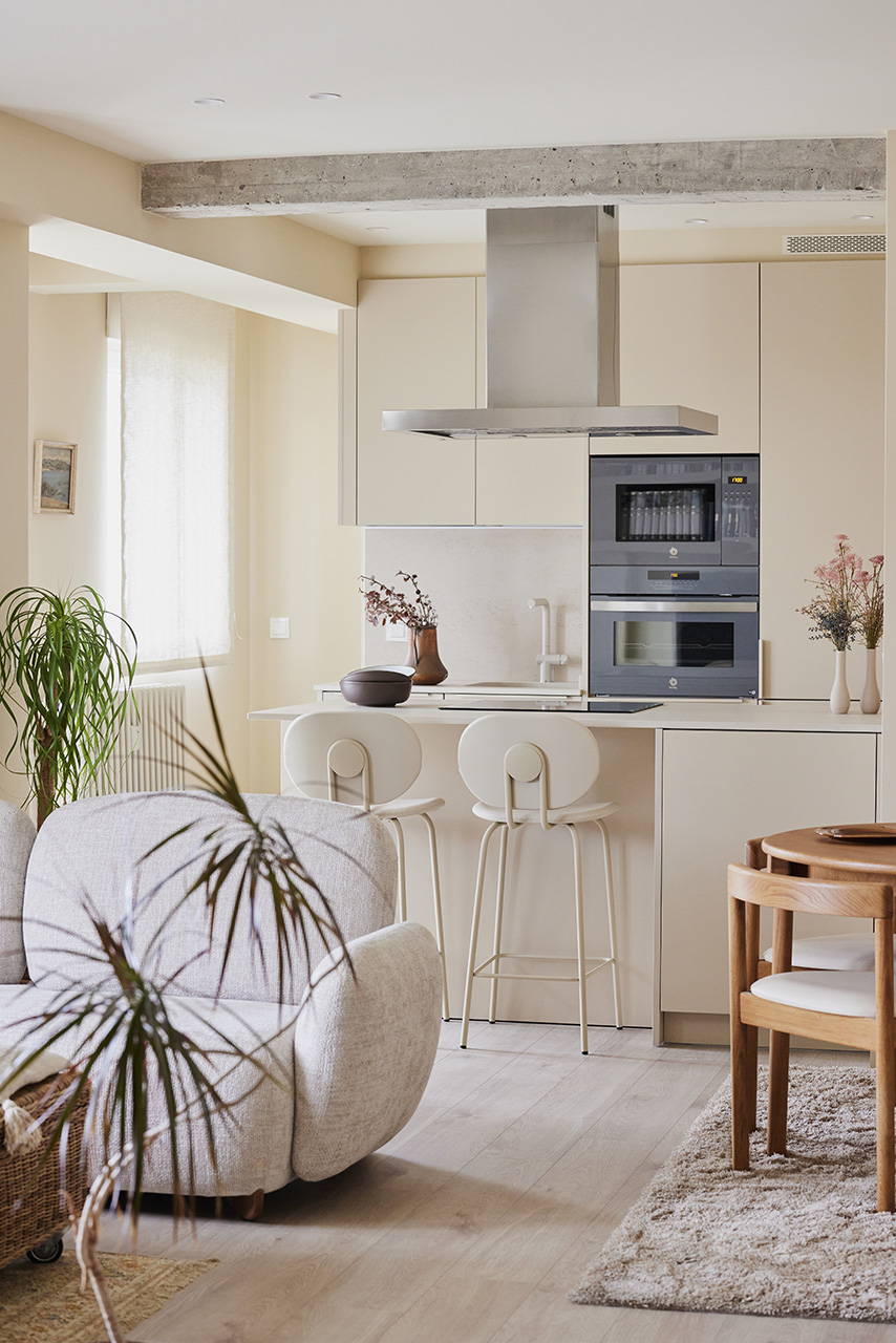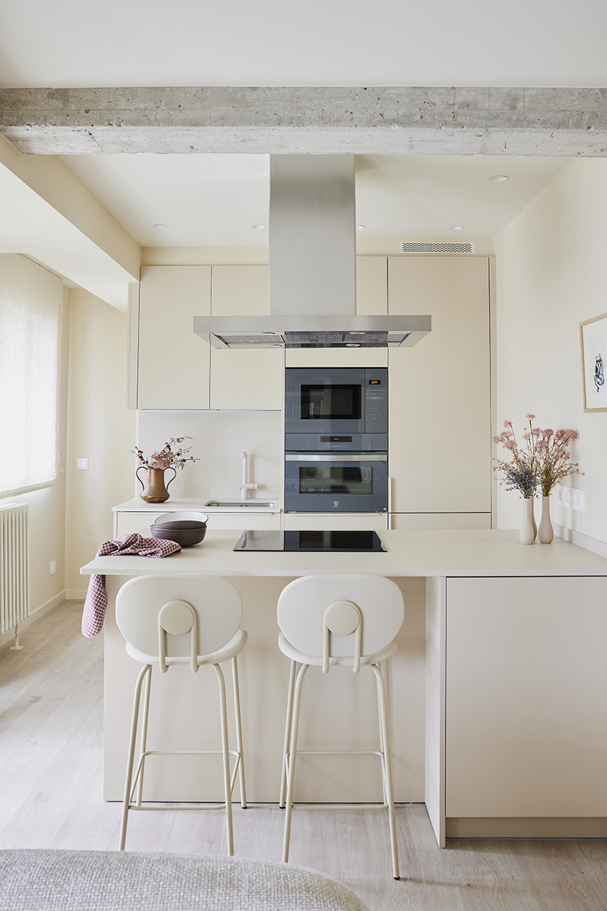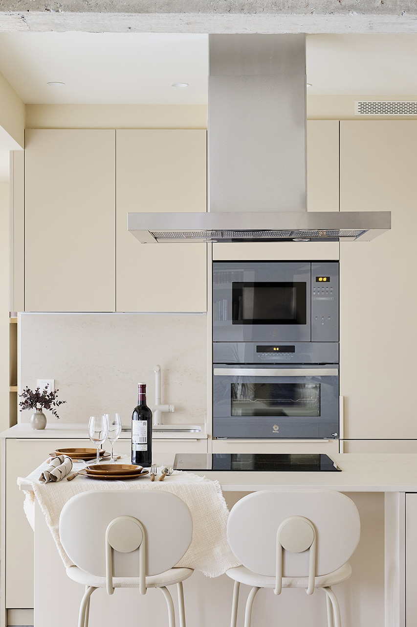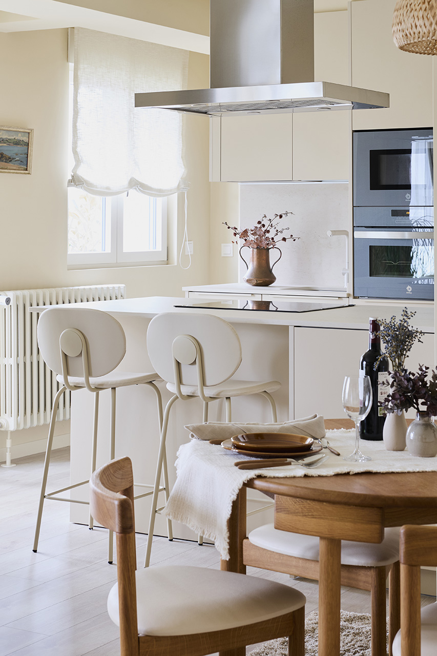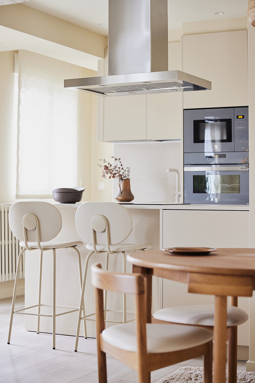 La distribución incluye un frente con columnas y una península con zona de cocción y almacenamiento, además de una zona de taburetes para desayunos informales. Los electrodomésticos se integraron para mantener la uniformidad, y se eligió una campana decorativa de acero inoxidable y hornos en tono grafito. La encimera, de material porcelánico, y detalles decorativos personales completan el diseño, creando un espacio funcional, estético y adaptado a las necesidades de la propietaria.