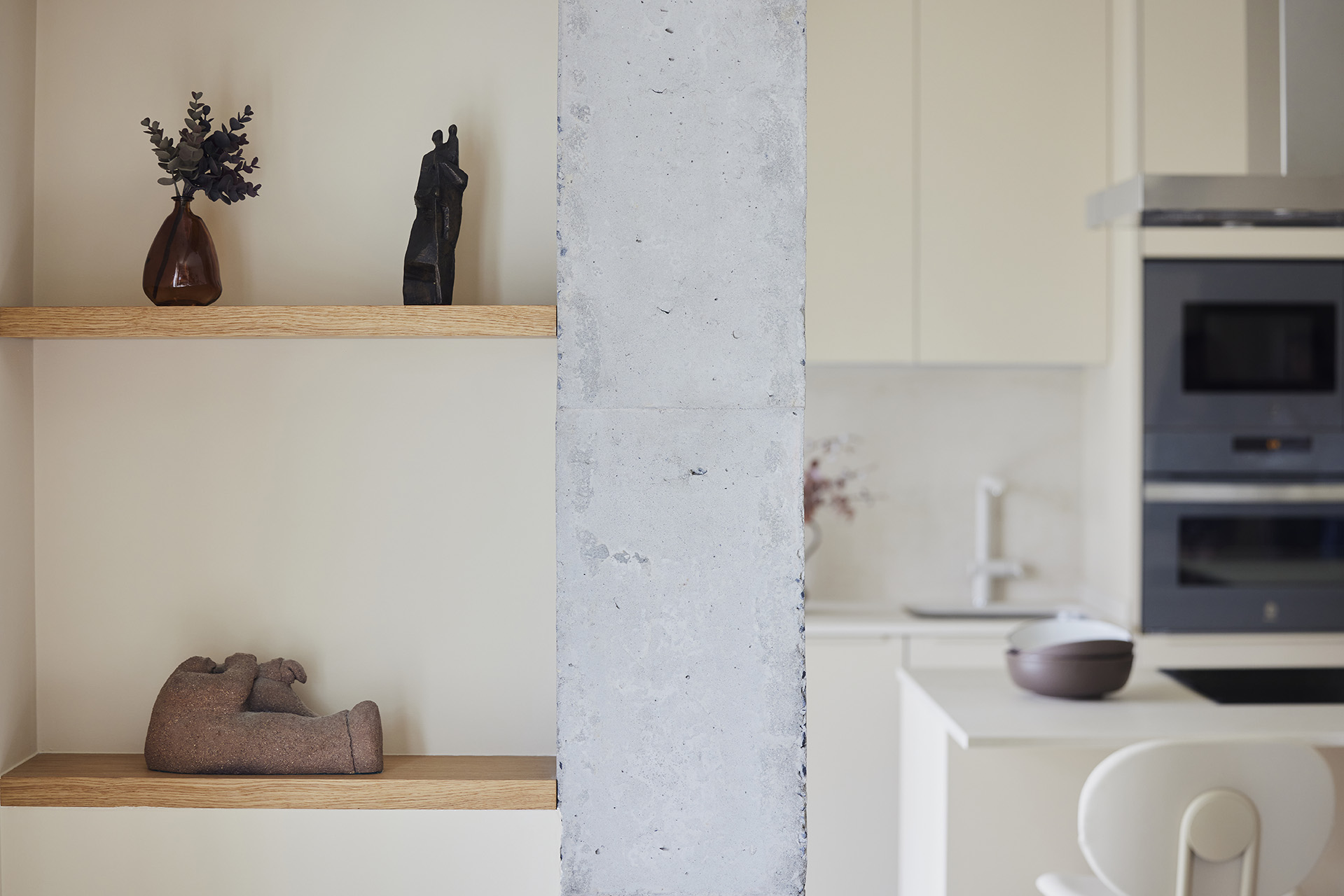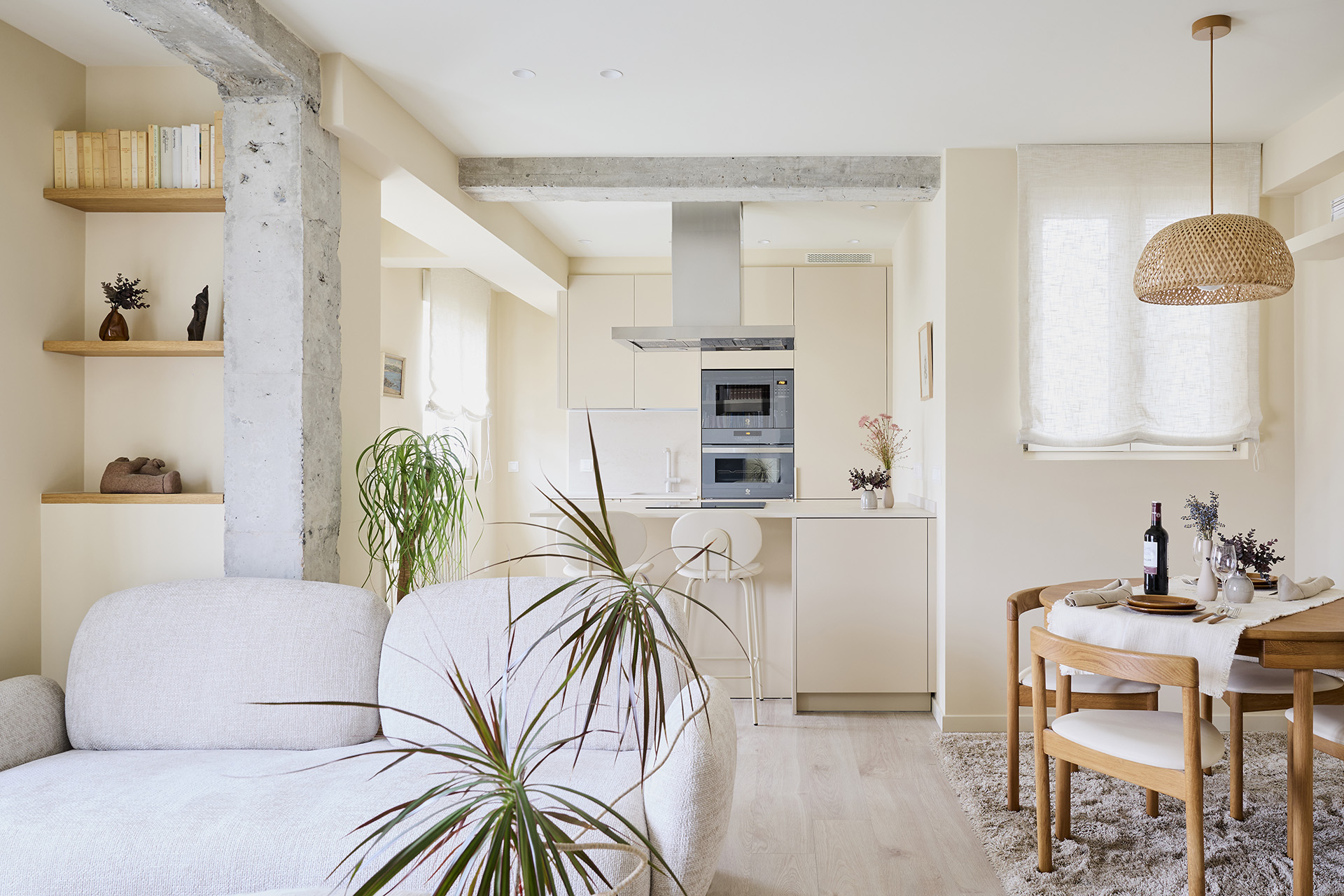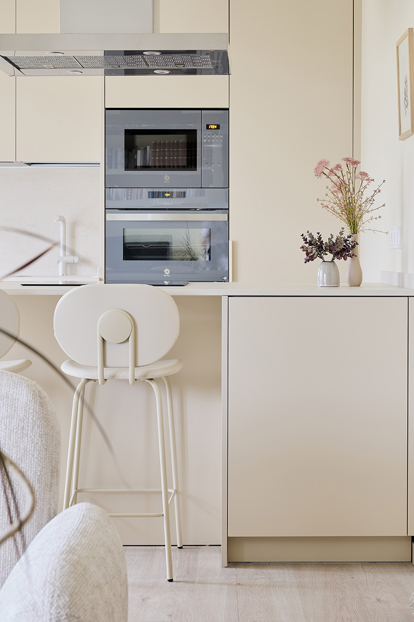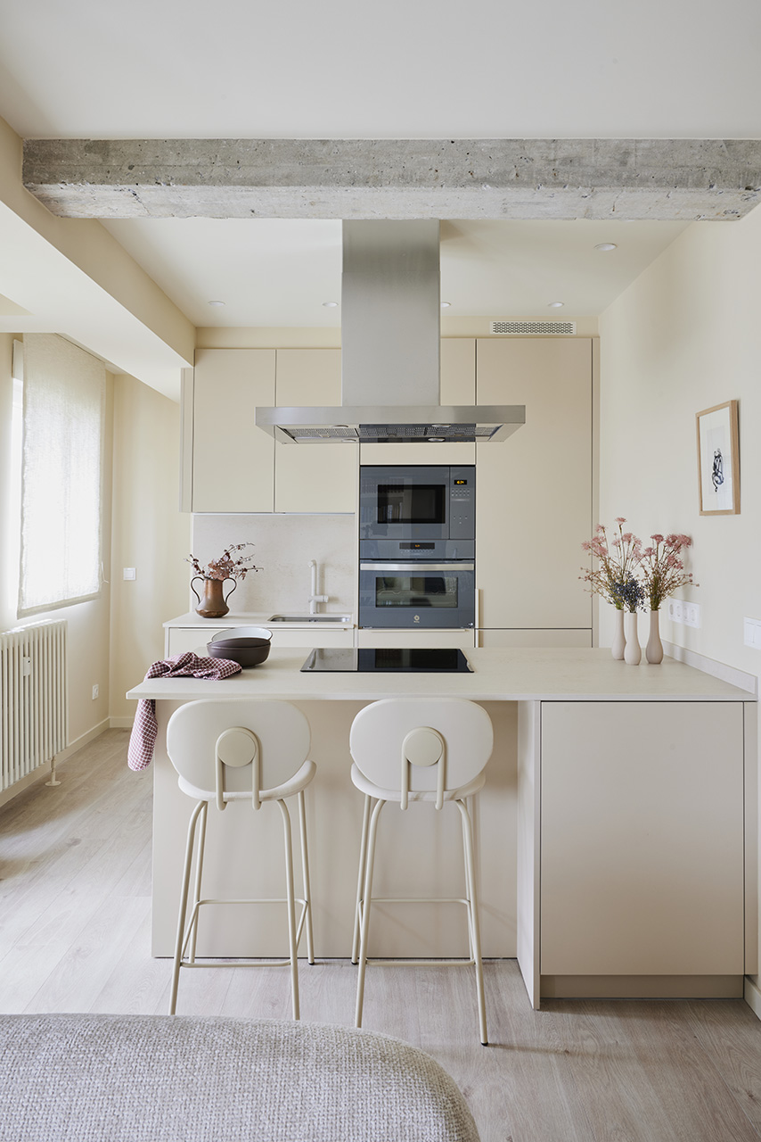 La distribución incluye un frente con columnas y una península con zona de cocción y almacenamiento, además de una zona de taburetes para desayunos informales. Los electrodomésticos se integraron para mantener la uniformidad, y se eligió una campana decorativa de acero inoxidable y hornos en tono grafito. La encimera, de material porcelánico, y detalles decorativos personales completan el diseño, creando un espacio funcional, estético y adaptado a las necesidades de la propietaria.